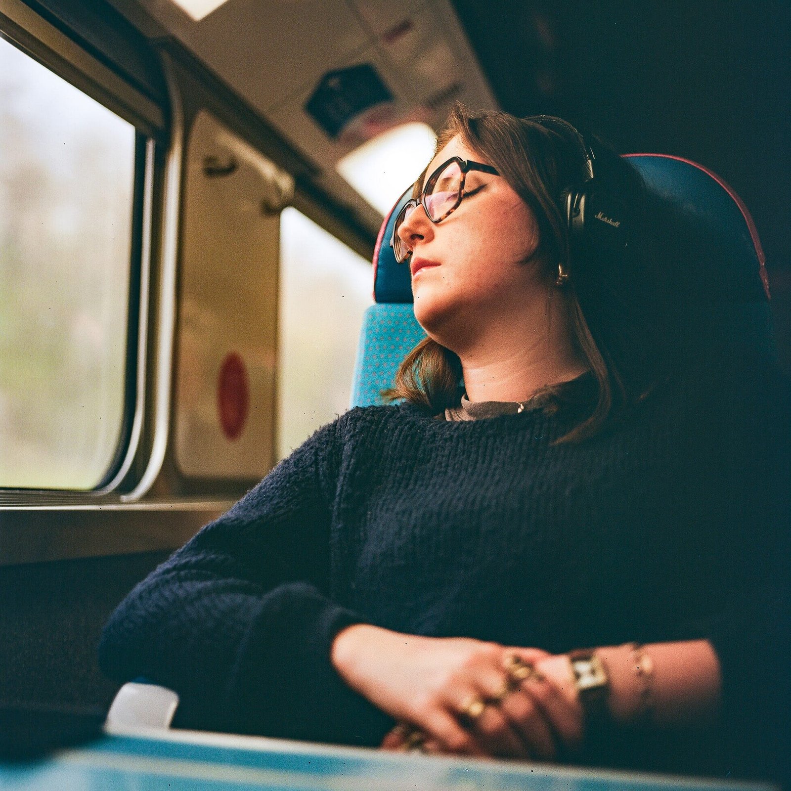 Portrait d’Adèle à bord d’un train en direction de Marseille, réalisé en avril 2025 avec un Hasselblad 500 C/M et une pellicule Kodak Gold 200. La lumière douce de la fenêtre éclaire son visage alors qu’elle se repose, casque sur les oreilles, le regard tourné vers l’extérieur. Un moment de calme et d’intimité en voyage, capté sur pellicule.