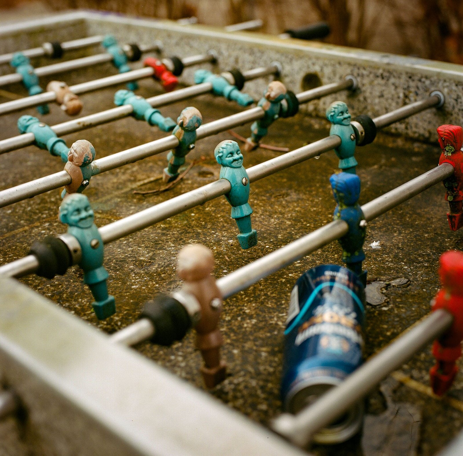 Photographie réalisée en février 2025 dans une rue de Nantes. Un baby-foot usé par le temps, sous la pluie, avec une canette abandonnée au milieu du terrain. Cette scène urbaine inattendue évoque le passage du temps et l’abandon d’objets du quotidien dans l’espace public. Prise de vue avec un Hasselblad 500 C/M et un objectif Zeiss 80mm f/2.8 sur pellicule Kodak Portra 400.