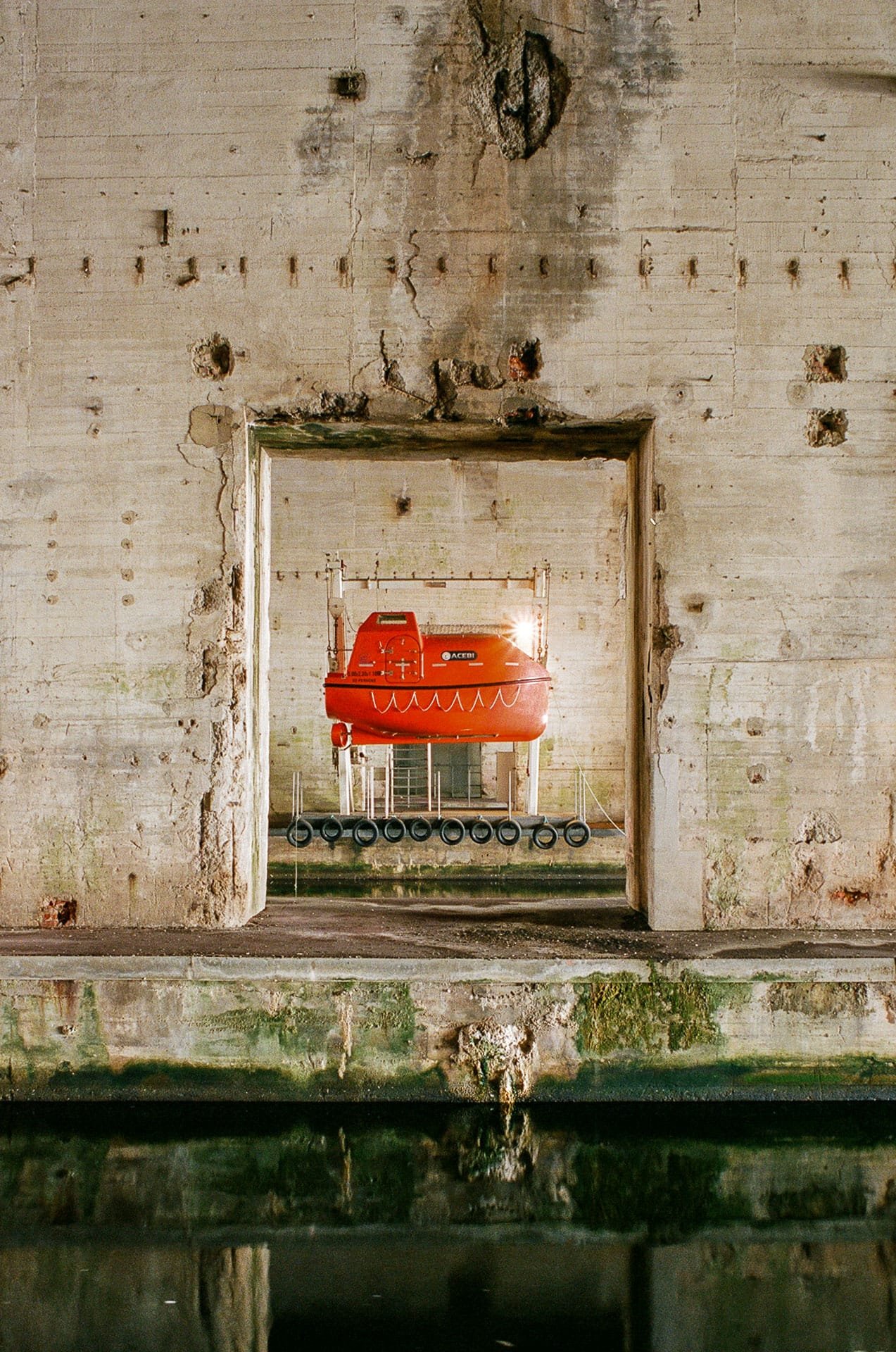 Photographie réalisée à la base sous-marine de Saint-Nazaire en novembre 2024. La scène montre un canot de sauvetage rouge suspendu, encadré par une large ouverture dans le béton brut de la structure. L’eau stagnante reflète partiellement les parois de la base, créant une atmosphère à la fois industrielle et graphique. Nikon F3 équipé d’un Nikkor 50mm f/1.2 sur pellicule Kodak Portra 400.