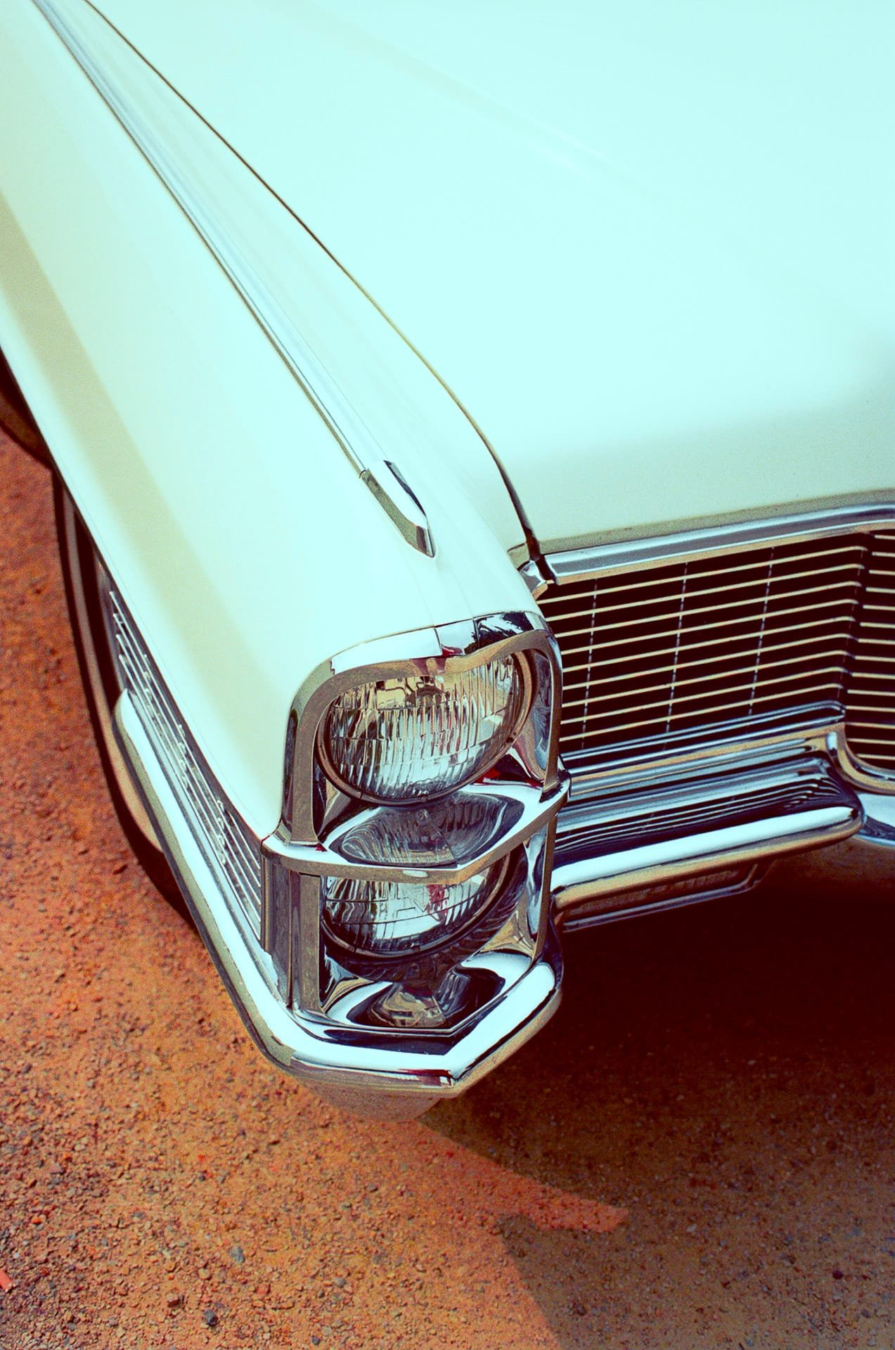 Photographie prise à Tharon Plage en août 2025, montrant le détail de l’avant d’une Cadillac vintage couleur crème, garée sur un sol rouge ocre. La brillance du chrome contraste avec la douceur de la lumière estivale. Réalisée avec un Nikon F3 HP, objectif Nikkor 50mm f/1.2, sur pellicule Kodak Portra 160.