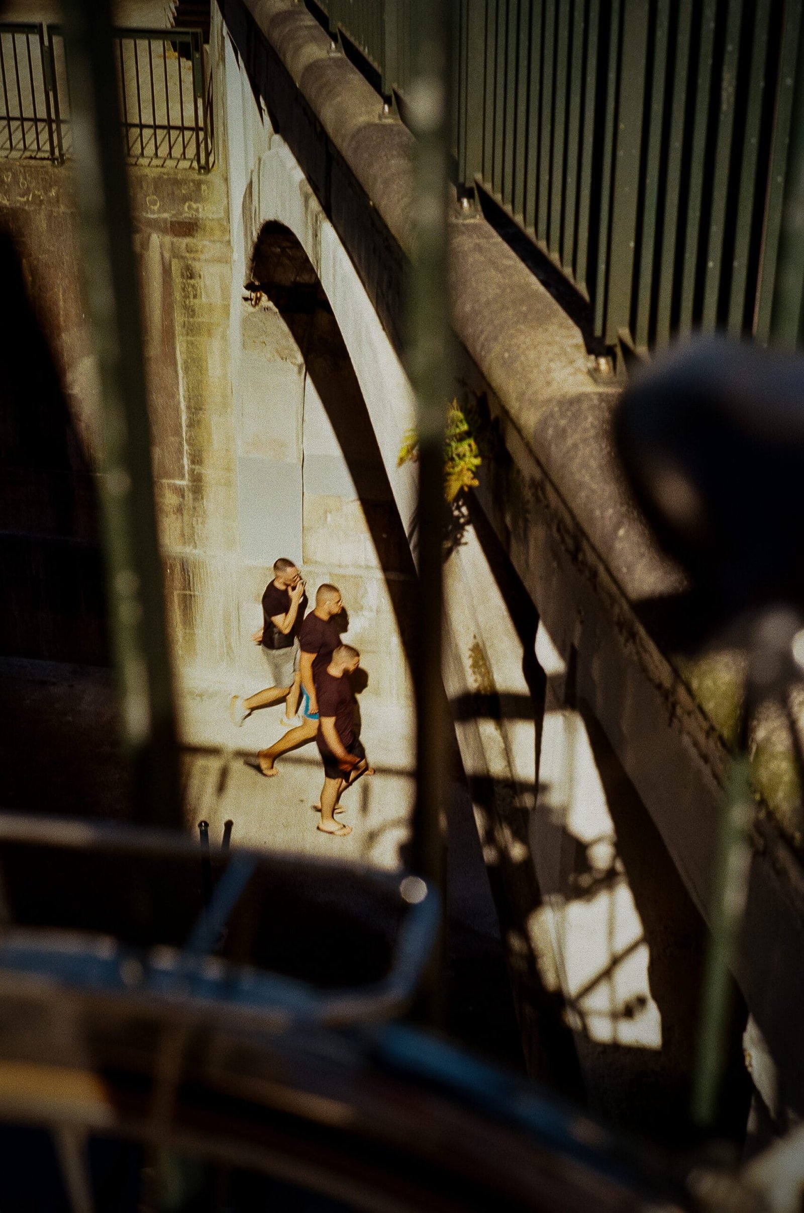 Photographie réalisée en juillet 2025 dans le centre-ville de Nantes. La scène, capturée depuis un pont ou un garde-corps, montre trois jeunes hommes marchant pieds nus, baignés par une lumière d’été crue qui dessine des ombres marquées sur le mur. Prise au Leica M3 avec un objectif Summicron 50mm sur pellicule Kodak Portra 160, cette image en couleur joue sur la géométrie, les ombres projetées et le contraste entre l’intimité de la scène et la distance du point de vue. Une photo discrètement volée, à travers les barreaux.