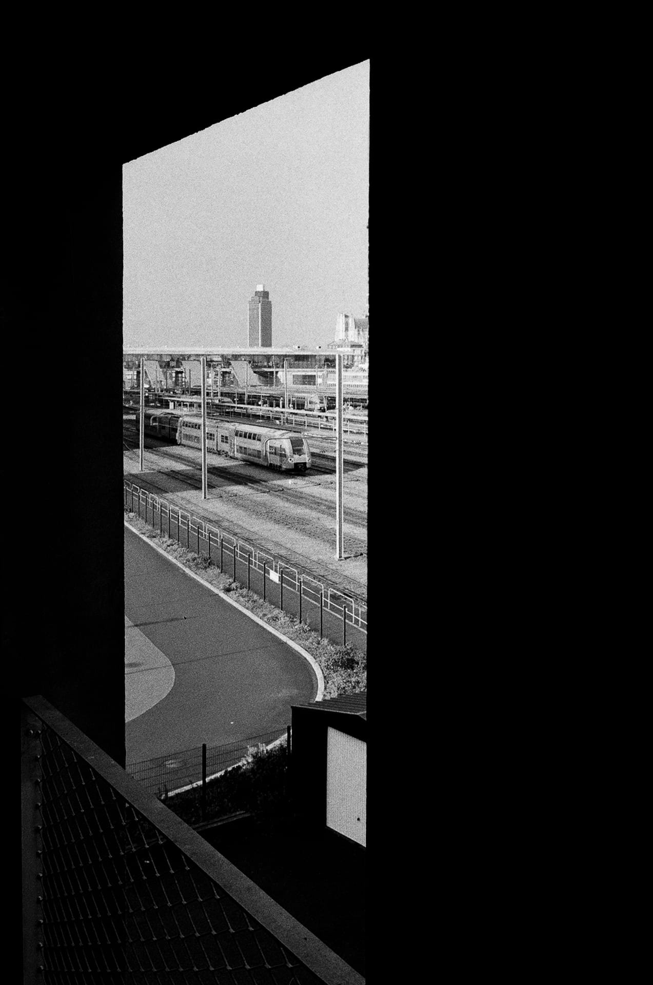 Photographie en noir et blanc réalisée depuis le parking Gare Sud à Nantes. L’architecture du bâtiment crée un cadre étroit et presque abstrait, dans lequel s’inscrit la gare et ses voies ferrées. Le contraste entre les masses sombres du béton et la clarté de la scène extérieure isole le paysage urbain comme une image découpée, fragment de ville observé à distance.
