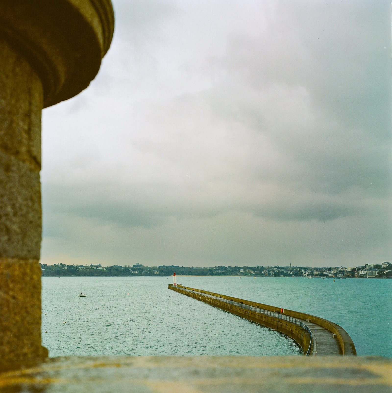 Photographie de la jetée du Môle des Noires à Saint-Malo prise en mars 2025. L’image, capturée avec un Hasselblad 500 C/M et un Zeiss 80mm f/2.8, met en scène la jetée s’avançant vers le phare rouge emblématique, sous un ciel chargé. La pellicule Kodak Portra 160 apporte une belle restitution des teintes douces et des contrastes subtils, malgré la lumière diffuse d’un temps couvert.
