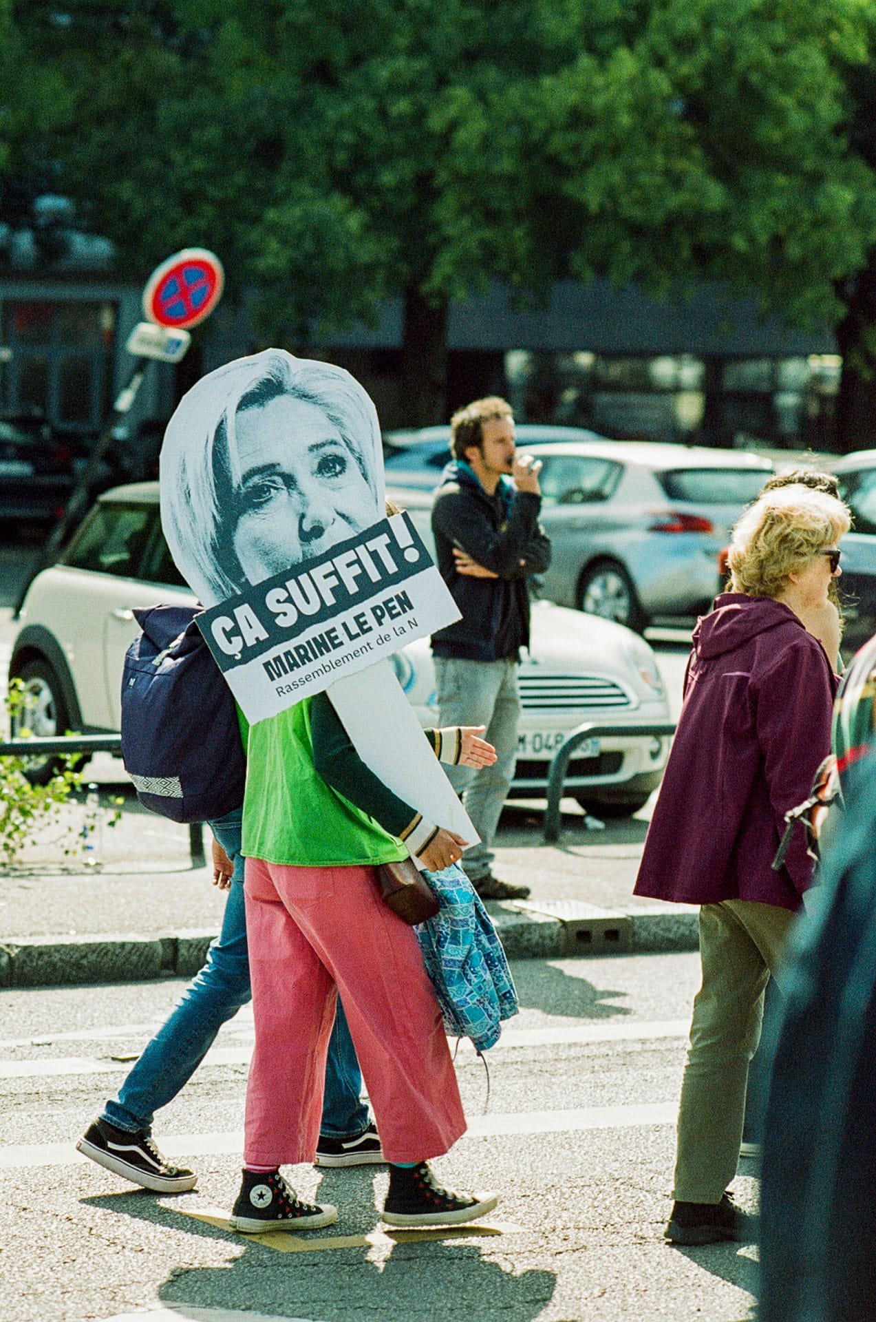 Photographie prise lors d’une manifestation à Nantes en septembre 2025. Au centre de l’image, une personne brandit une pancarte représentant le visage de Marine Le Pen avec le message “Ça suffit !”. L’ambiance est à la fois sérieuse et visuellement percutante, accentuée par les couleurs franches de la tenue et le piqué de l’objectif 105mm. Nikon F3 HP, Nikkor 105mm f/2.5, pellicule Kodak Portra 160.