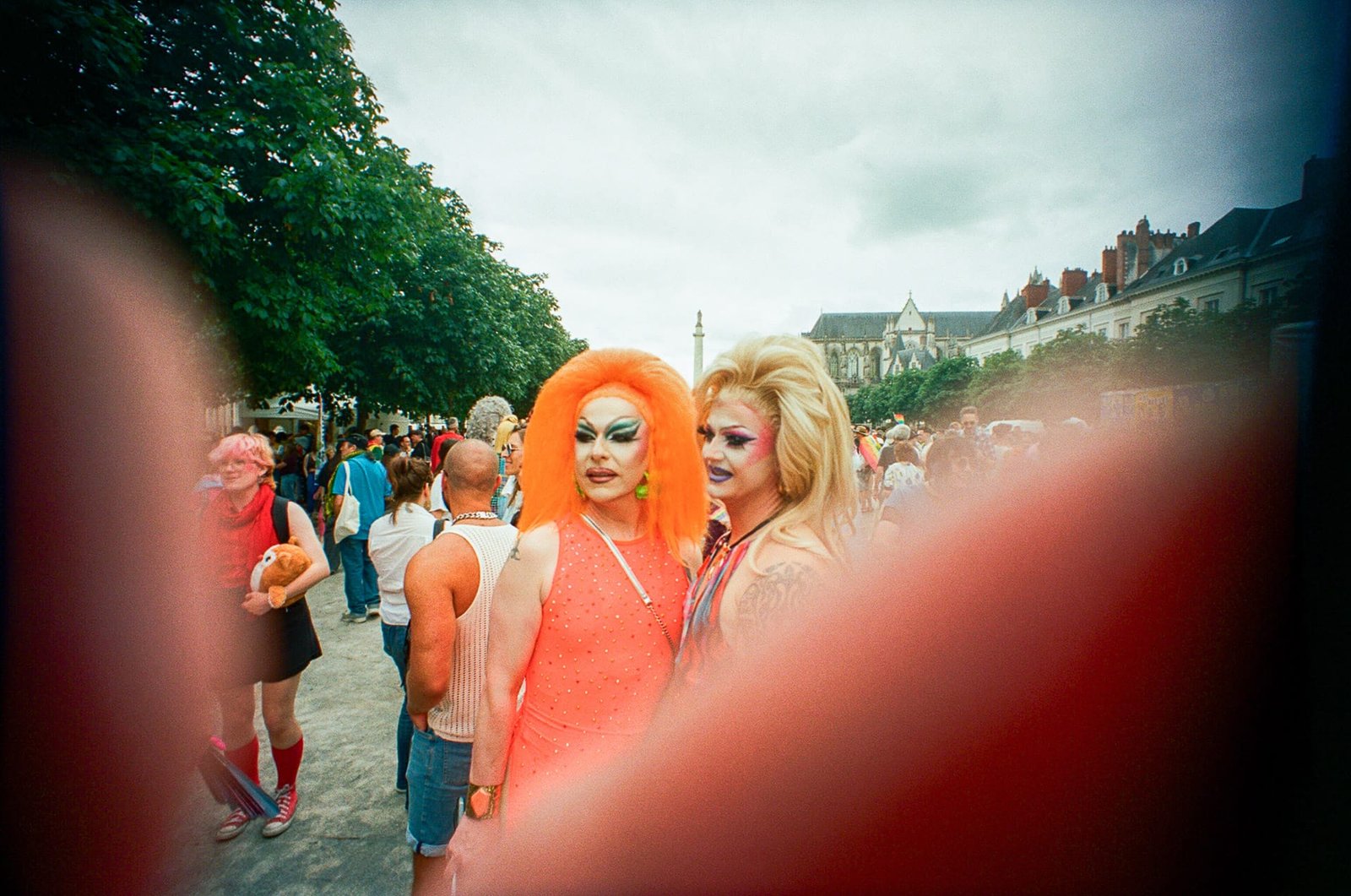 Portrait spontané de deux drag queens durant la Marche des Fiertés à Nantes, pris en juin 2025. Lomo LC Wide, pellicule LomoChrome Metropolis.. Une photo imparfaite avec un doigt dans le cadre, mais pleine de vie.