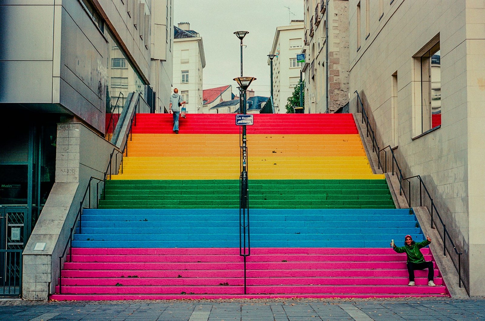 Photographie prise en plein été 2025, au cœur du centre-ville de Nantes, sur les fameuses Marches des Fiertés situées rue Beaurepaire. Ce sont les marches peintes aux couleurs du drapeau LGBT, désormais officiellement nommées ainsi par la municipalité après plusieurs épisodes de vandalisme et de recouvrement. Cette intervention emblématique symbolise les valeurs d’inclusion et de visibilité chères à la communauté LGBTQIA+.