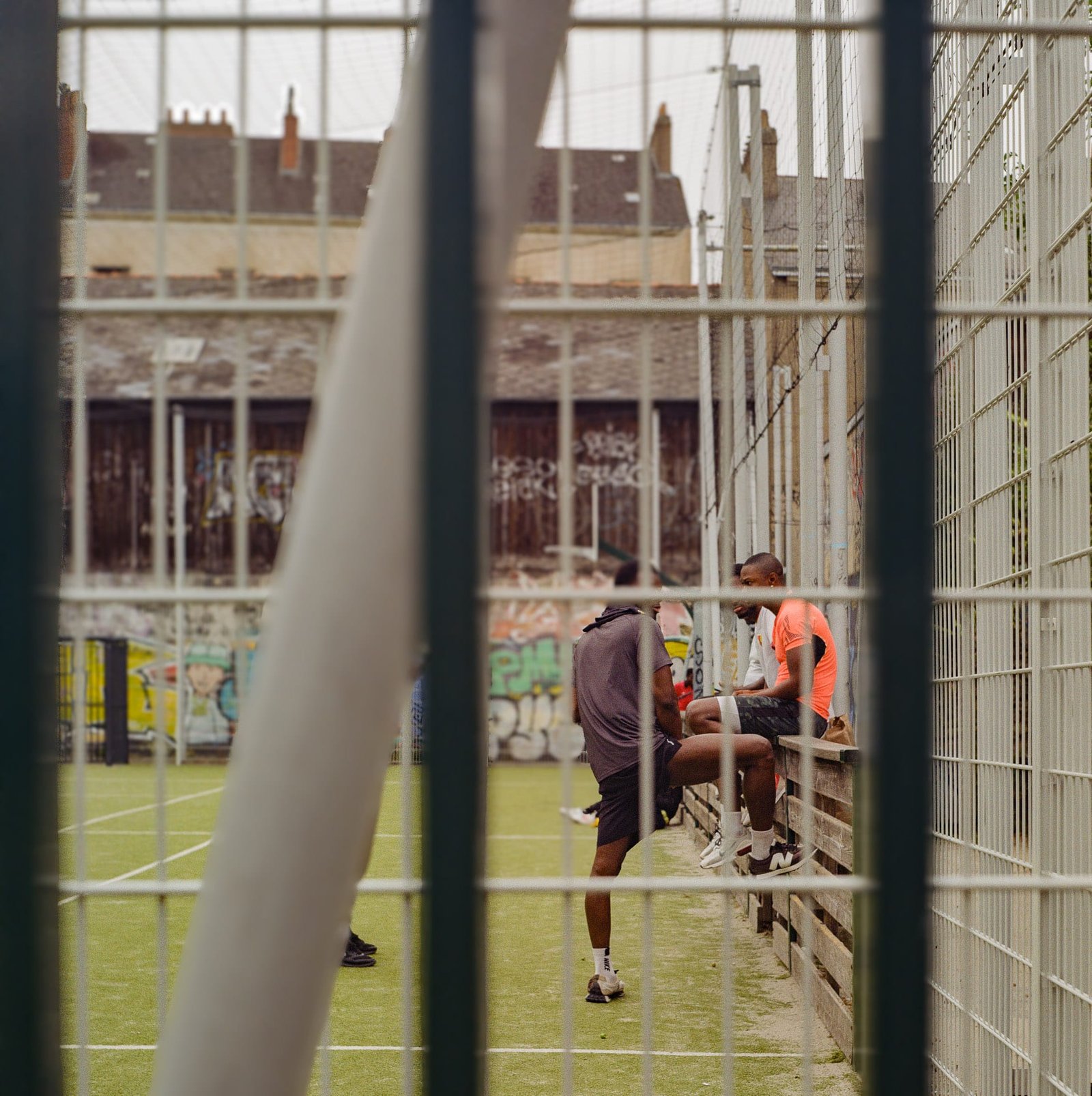 Photographie réalisée en juillet 2024 dans un city stade de Nantes. La scène montre deux jeunes en pleine discussion, l’un assis sur une barrière en bois, l’autre debout, encadrés par les grilles du terrain. À l’arrière-plan, les murs sont couverts de graffitis colorés, créant un contraste fort avec la structure métallique du stade. La prise de vue, légèrement décentrée derrière les barreaux, accentue la sensation d’observer une scène de vie urbaine sur le vif. Appareil Yashica Mat 124G, pellicule Kodak Gold 200.