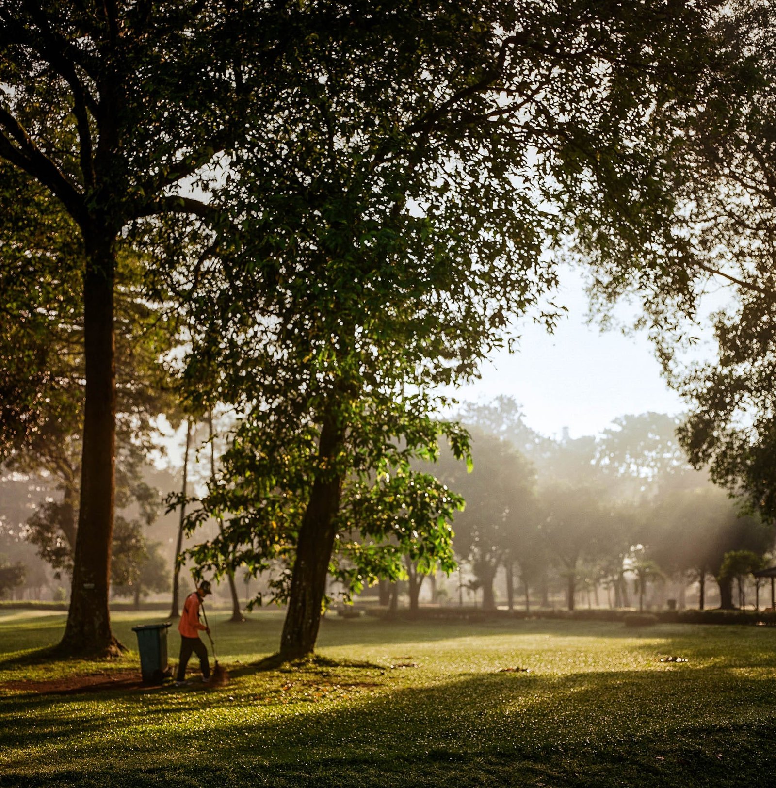 Un balayeur traverse calmement le cadre, conférant à cette image une atmosphère paisible et contemplative.