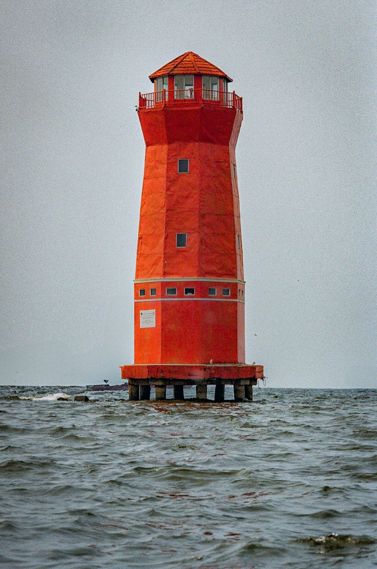 Photographie du phare du port de Jakarta, réalisée en mai 2025 avec un Nikon F3 HP et un objectif Nikkor 105mm f/2.5. Isolé en pleine mer sur ses pilotis, ce phare rouge vif contraste avec le ciel brumeux. La scène a été capturée sur pellicule Kodak Portra 400, restituant fidèlement la texture du béton et les teintes douces de l’océan.