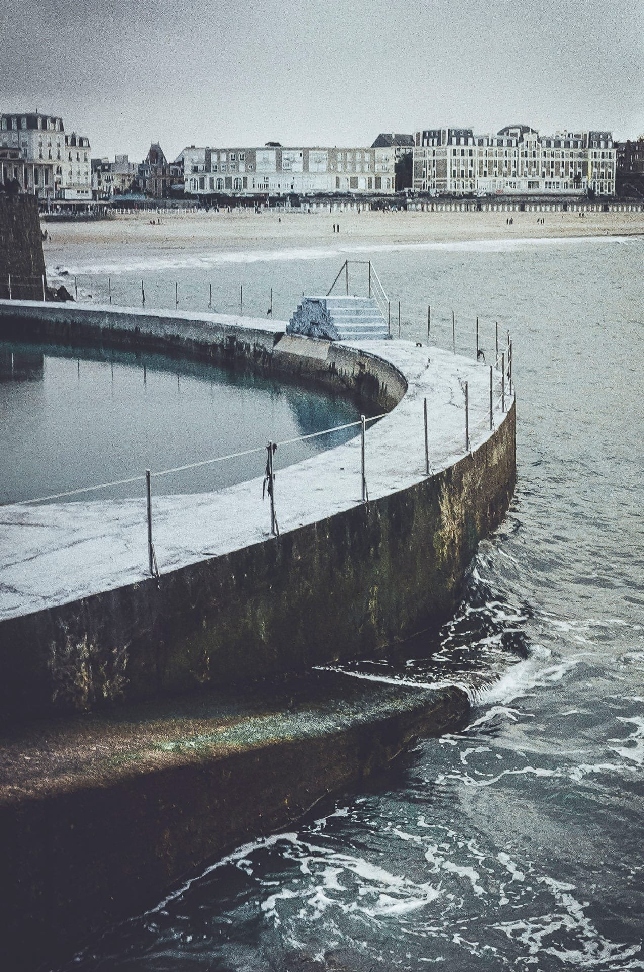La piscine de mer de la plage de l’Écluse à Dinard et sa grande courbe en granite, photographiée depuis le bord de mer. Les façades de la ville s’étendent en arrière-plan. Photo argentique au Nikon F3, objectif Micro-Nikkor 55mm f/2.8, sur LomoChrome Color ’92.