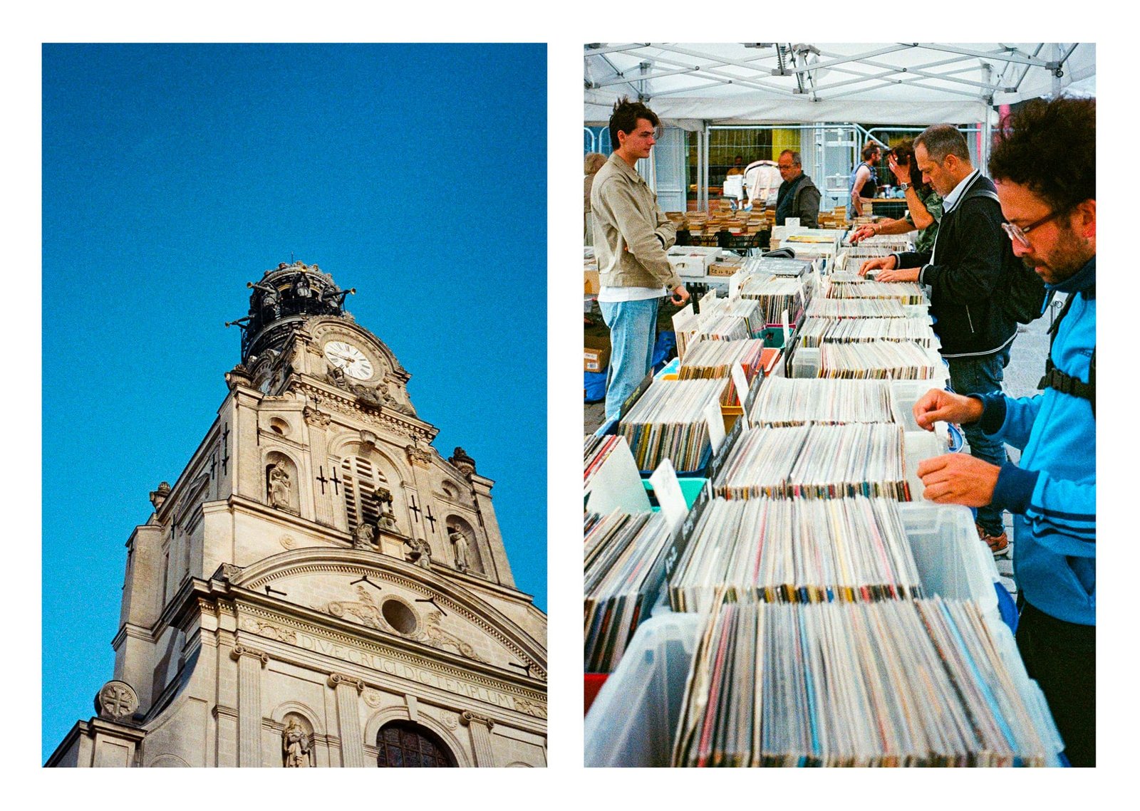 À droite : une brocante dédiée aux disques vinyles, avec plusieurs chineurs passionnés scrutant les bacs à la recherche de pépites musicales.