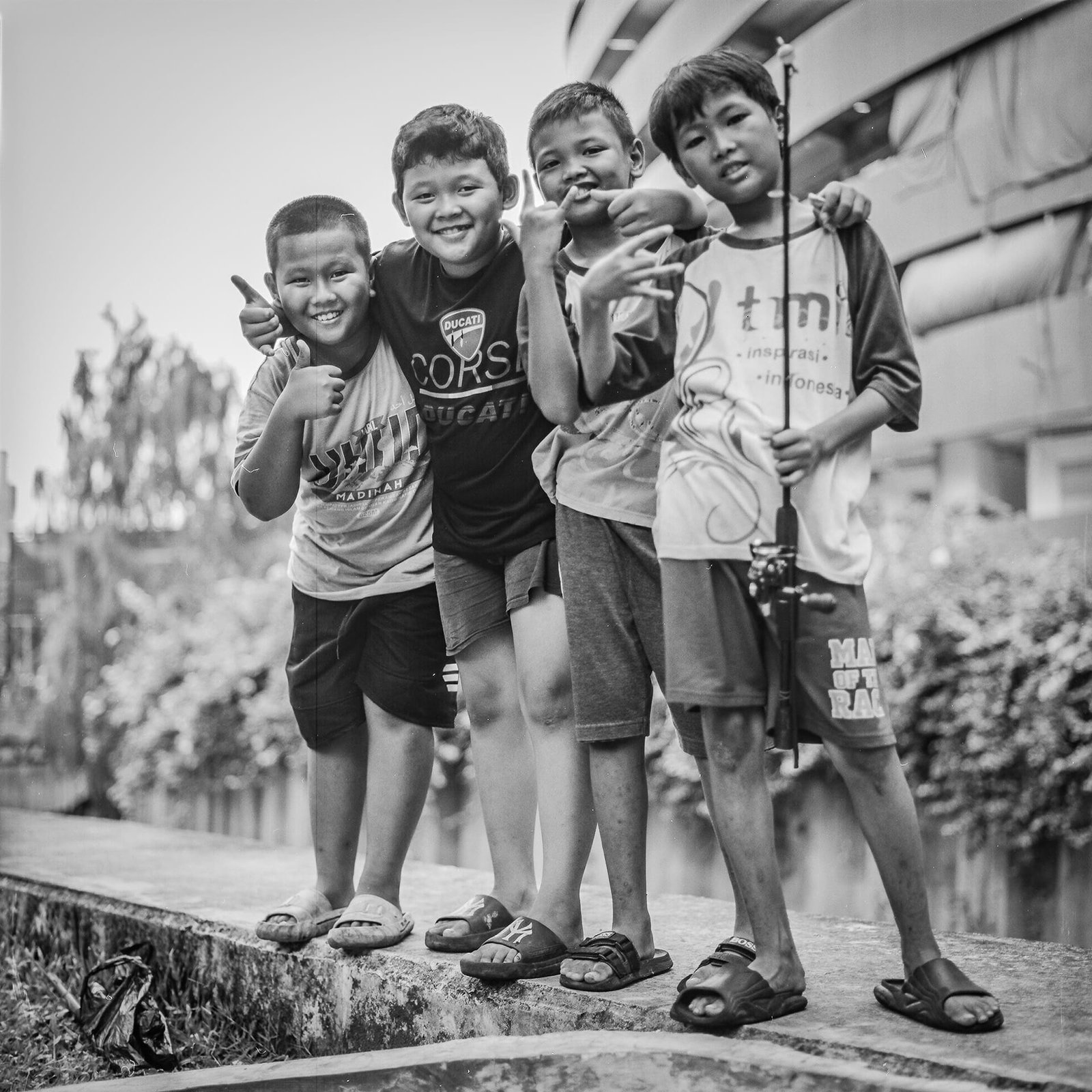Un groupe d’enfants complices posent fièrement après une session de pêche urbaine à Jakarta. Photo prise avec le Hasselblad 500 C/M, Zeiss 80mm f/2.8 sur une pellicule Ilford FP4.