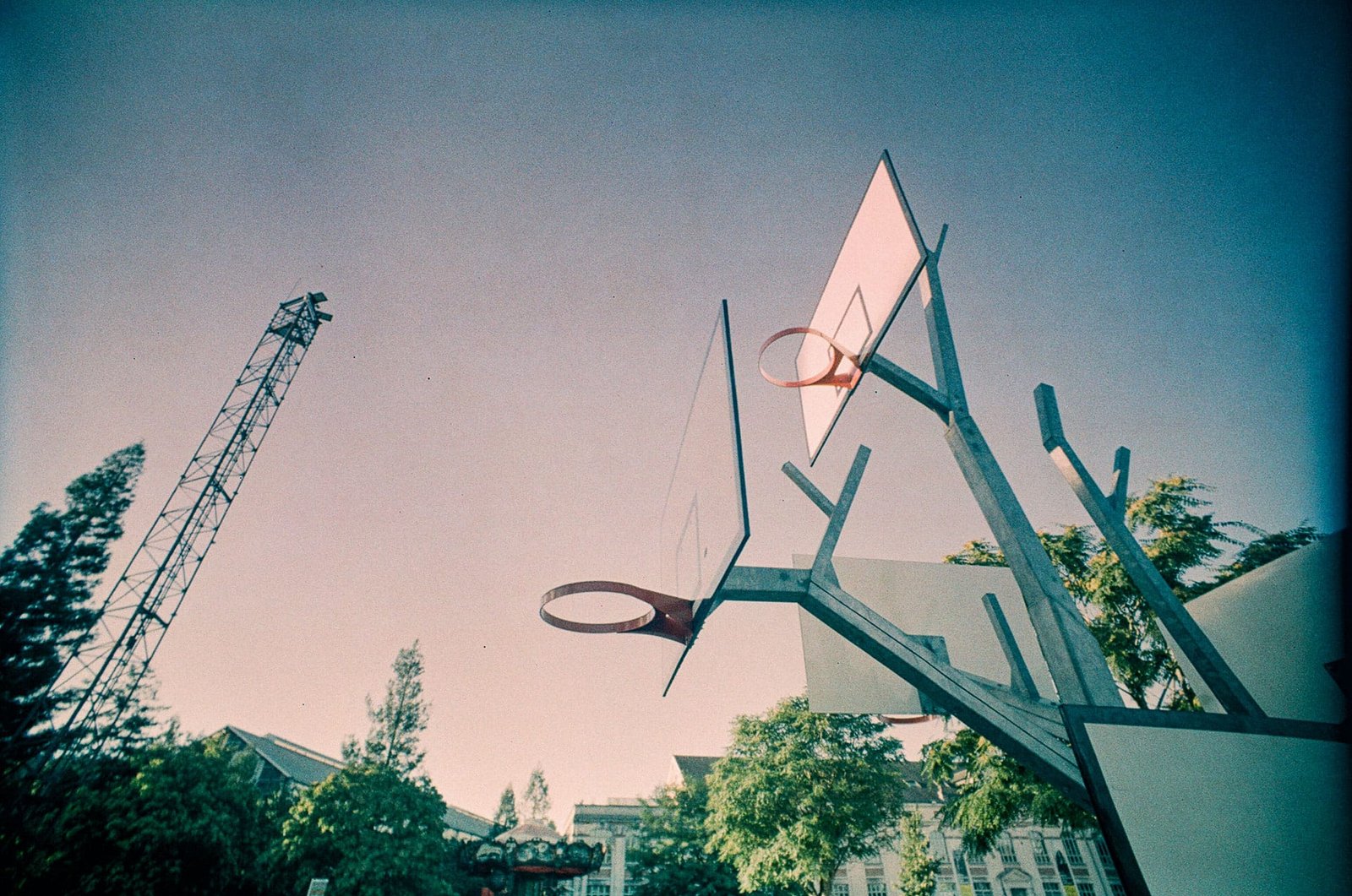 Arbre à basket, terrain de basket revisité de façon artistique aux Machines de l’Île à Nantes. Photo prise en juin 2025 avec un Lomo LC Wide et pellicule LomoChrome Metropolis..