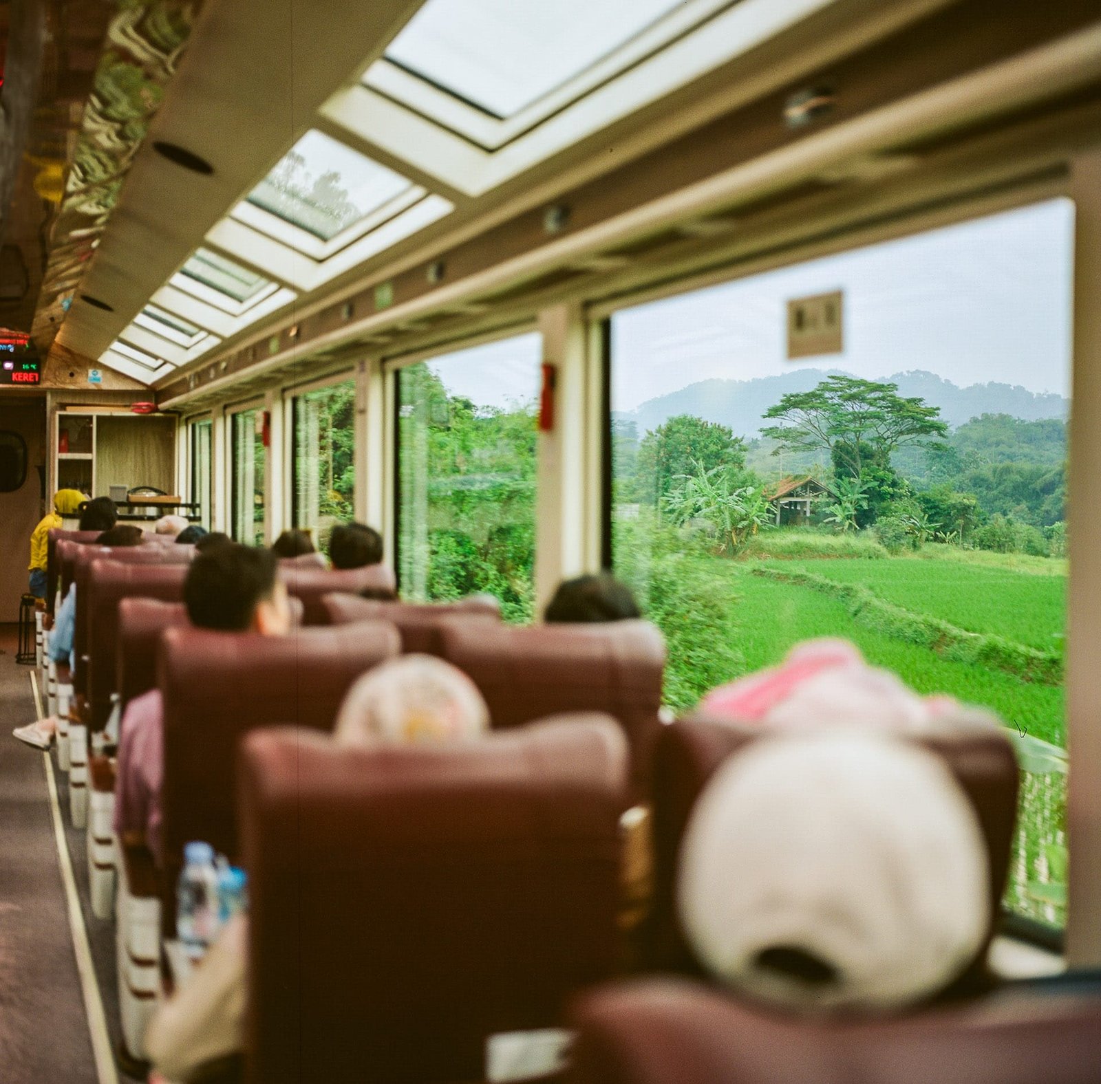 Grâce à ses vastes baies vitrées et puits de lumière, ce train permet une immersion visuelle totale dans les paysages luxuriants de l’Indonésie : rizières verdoyantes, collines brumeuses et végétation tropicale défilent paisiblement à travers les fenêtres.