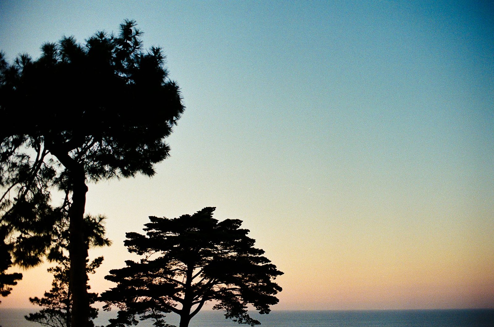 Photographie capturée au lever du soleil en mars 2025, depuis une chambre de l’hôtel Royal à La Baule. Les silhouettes de pins se découpent sur un ciel pastel, entre bleu nuit et lumière dorée, en surplomb de l’océan encore calme. Prise avec un Nikon F3, objectif Nikkor 50mm f/1.2, sur pellicule Kodak Gold 200.