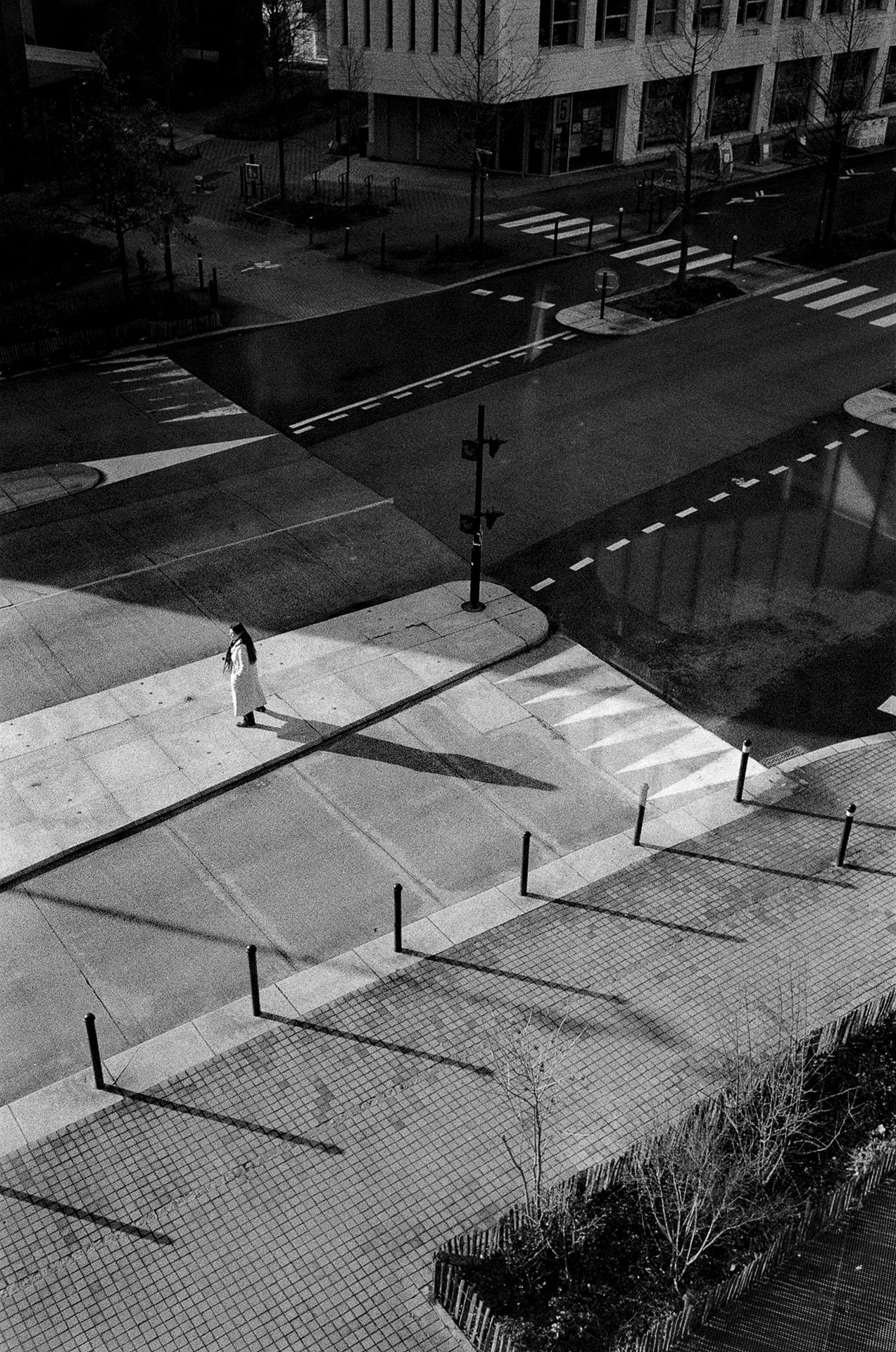 Photographie en noir et blanc réalisée à Nantes, vue depuis le parking Gare Sud. La scène est structurée par un quadrillage urbain rigide, des potelets alignés et de longues ombres projetées. Une silhouette solitaire traverse l’espace, créant un contraste fort entre présence humaine et géométrie froide de la ville.